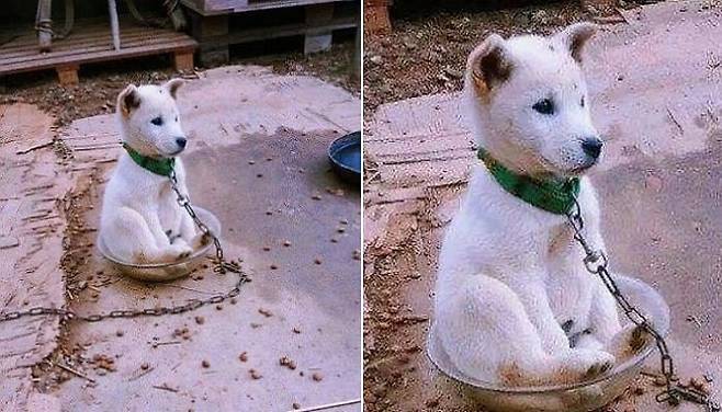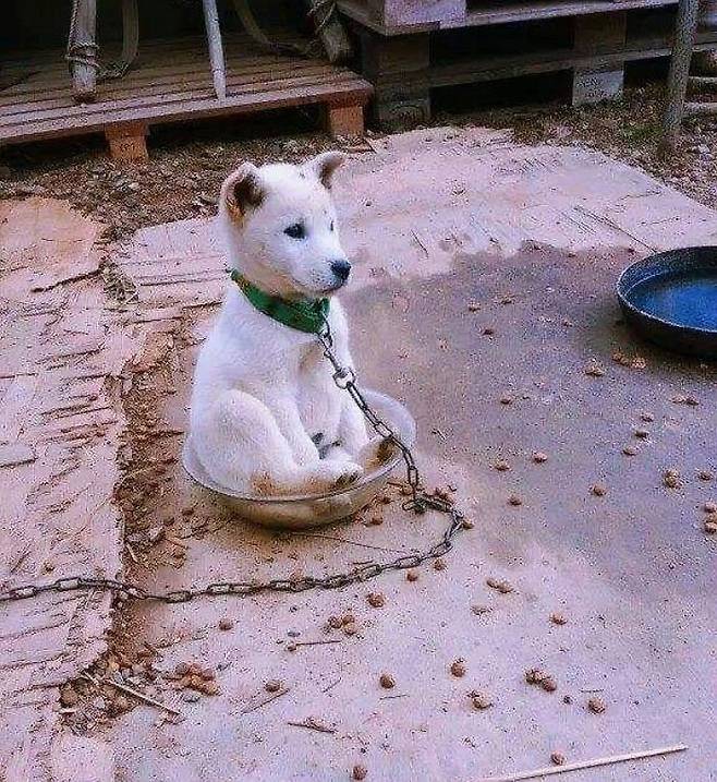 자기 밥 그릇에 들어가 평온하게 앉아있는 시골 댕댕이가 있는데요