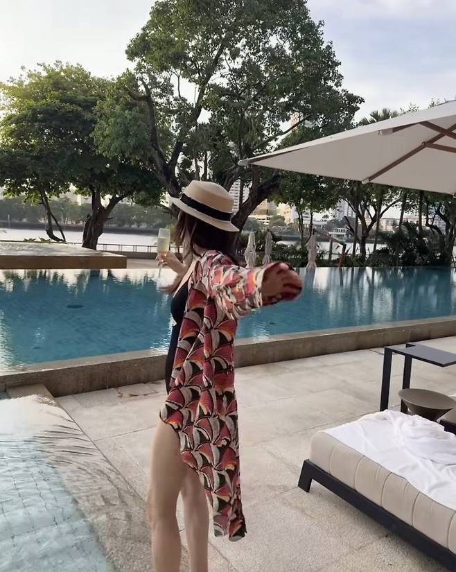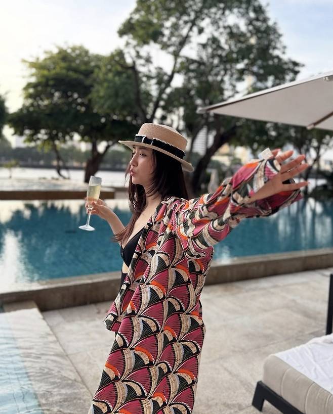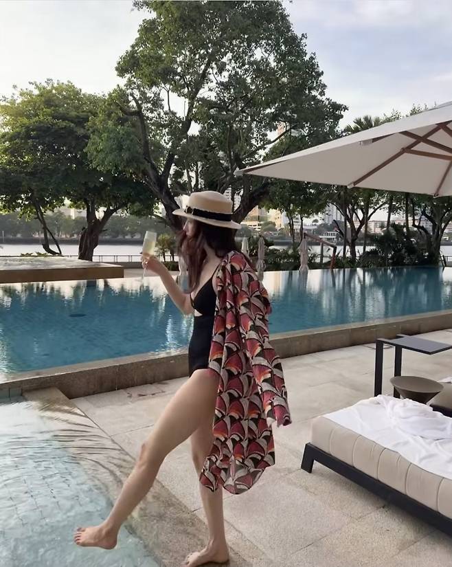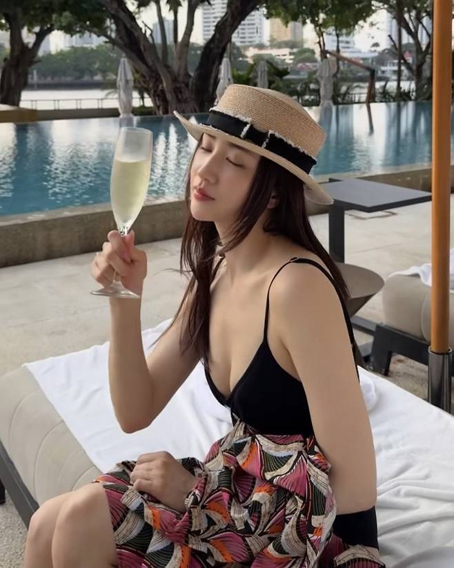 허리 라인 절개로 포인트를 준 수영복은 군살 없이 탄탄한 몸매를 강조했고, 넓은 챙의 스트로우 햇과 샴페인 잔을 든 여유로운 포즈가 어우러져 럭셔리한 바캉스 무드를 극대화했습니다.