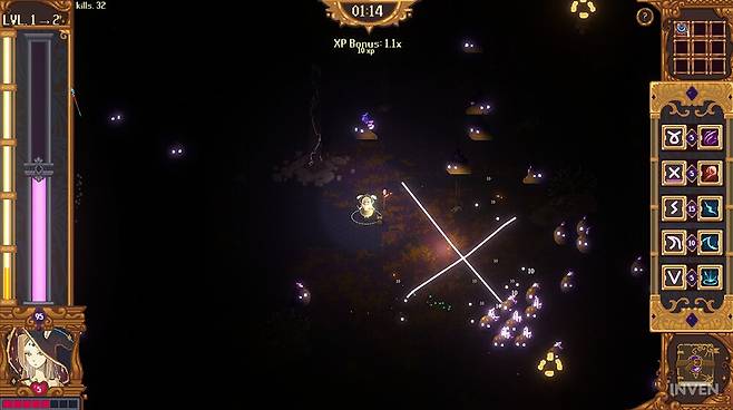레벨업을 하면서 얻게 되는 스킬들 중 발동형 스킬들은 각각 마법 문양을 보유하고 있습니다. 그 문양을 직접 마우스를 활용해 그리면, 스킬은 일정 시간 동안 활성화되죠. 스킬마다 지속 시간이 다르기에 적을 피하면서 스킬을 계속 유지할 필요가 있습니다.