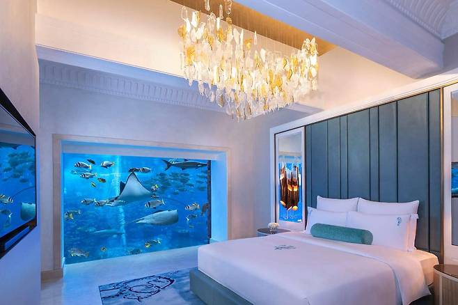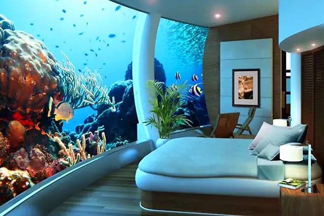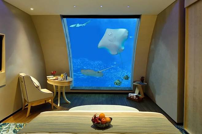 수중 호텔 객실에는 한쪽 벽면 전체가 아쿠아리움으로 되어 있어 객실에서 해저 풍경을 즐길 수 있죠.