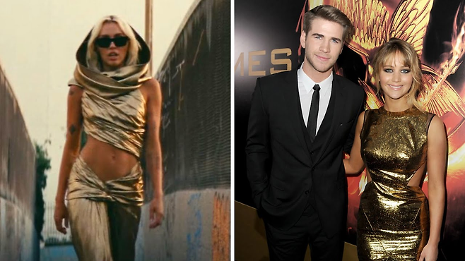 특히나 뮤직비디오에서 마일리가 입은 황금색 드레스가 '헝거게임' 시사회에서 입었던 드레스를 연상케 해, 제니퍼 로렌스와 리암 헴스워스가 당시 비밀연애를 했던 것이 아니냐는 의혹이 불거지기도 했습니다.