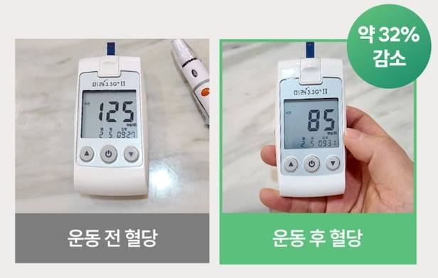 운동 효과는 숫자로 나타납니다. 자체 실험 결과에 따르면 스텝퍼 사용 후 혈당이 약 32% 감소한 것을 확인할 수 있습니다.