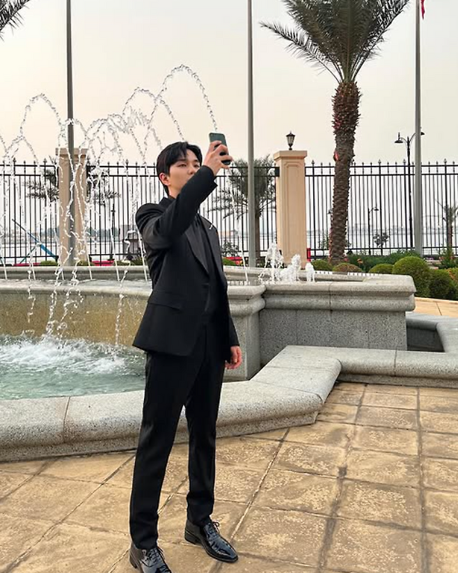 슈즈 또한 블랙 컬러로 통일하며 완벽한 올블랙 룩을 완성했어요. 매끈한 광택감이 있는 블랙 구두는 슈트와 자연스럽게 어우러지며 더욱 세련된 분위기를 연출했답니다.