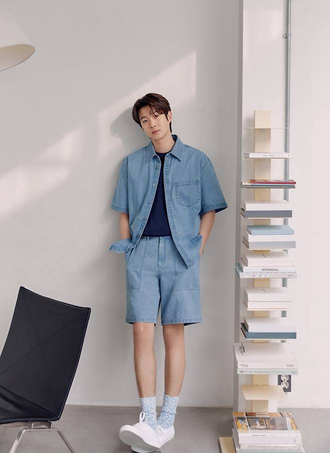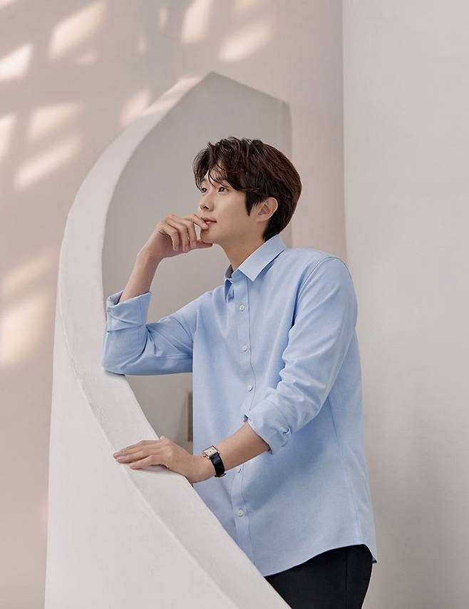 공개된 화보에서 최우식은 블루톤의 찰랑 셔츠를 세미 와이드핏 에어로쿨 슬랙스로 미니멀한 스타일을 완성했다.