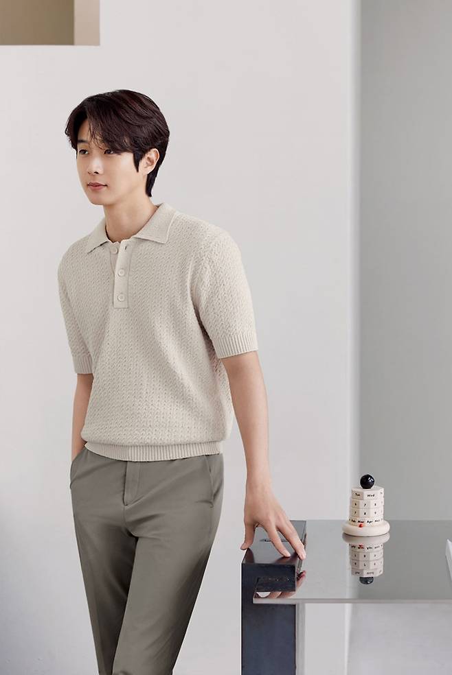 또 케이블 조직감의 반팔 카라 스웨터와 베이지 컬러 슬랙스의 톤온톤 매치로 군더더기 없는 깔끔한 스타일을 연출했다.