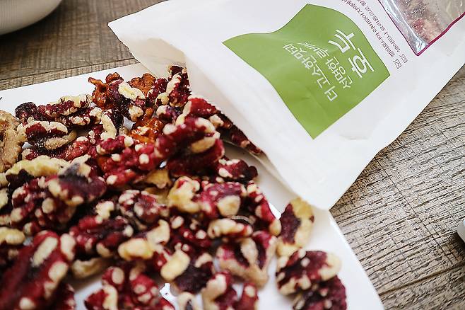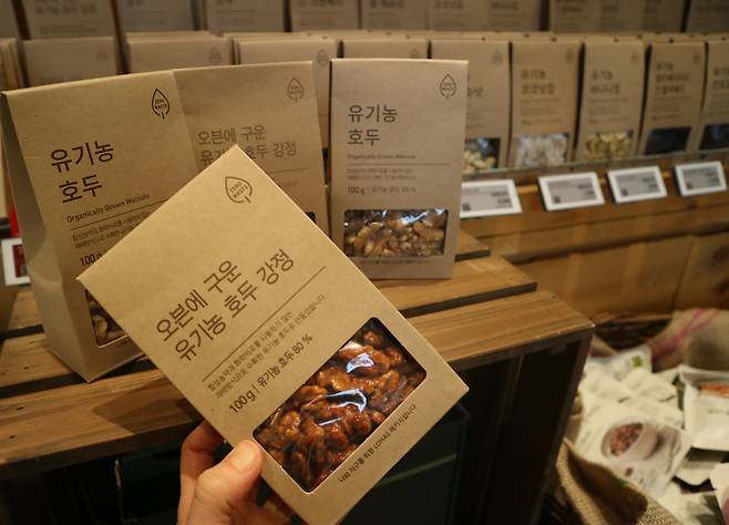 오븐에서 구운 달콤한 호두 강정도 있었다. 황수아 올가홀푸드 견과 상품기획자는 “보통 견과류 강정은 열풍건조식으로 만드는데, 오븐에 구울 경우 시간이 오래 걸리고, 오븐에 들어가는 양도 적기 때문”이라고 했다.