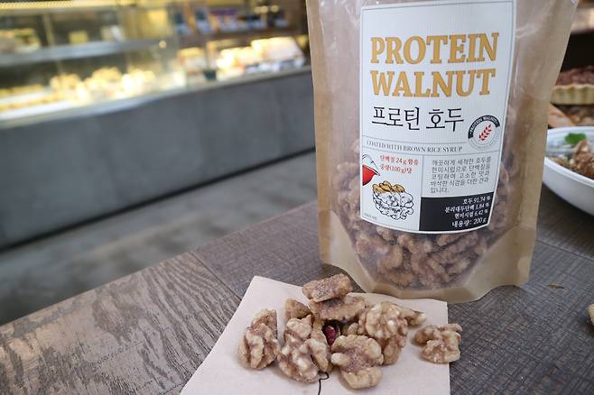 단백질이라는 메가트렌드에 충실한 호두도 있었다. 대두단백 분말을 껴안은 ‘프로틴 호두’ 제품이다. ‘식물성 단백질’과 호두에 풍부한 ‘오메가-3 지방’의 조합은 최근 가장 ‘핫한’ 영양소를 동시에 채울 수 있다는 점에서 눈에 들어왔다. 그 옆에는 설탕 대신 메이플 시럽을 몸에 바른 ‘메이플 호두’ 제품이 진열됐다.