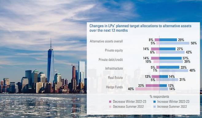 13일 영국계 글로벌 사모펀드 운용사 콜리캐피탈이 전세계 유한책임사원(LP) 112곳을 대상으로 설문조사를 실시한 결과를 보면 향후 1년간 대체자산 비중을 늘리겠다는 답은 29%, 줄이겠다는 답은 8%로 집계됐다. 올해 여름 조사 때 늘리겠다는 답이 50%에 달했던 것과 비교하면 절반 수준으로 줄어든 것이다.