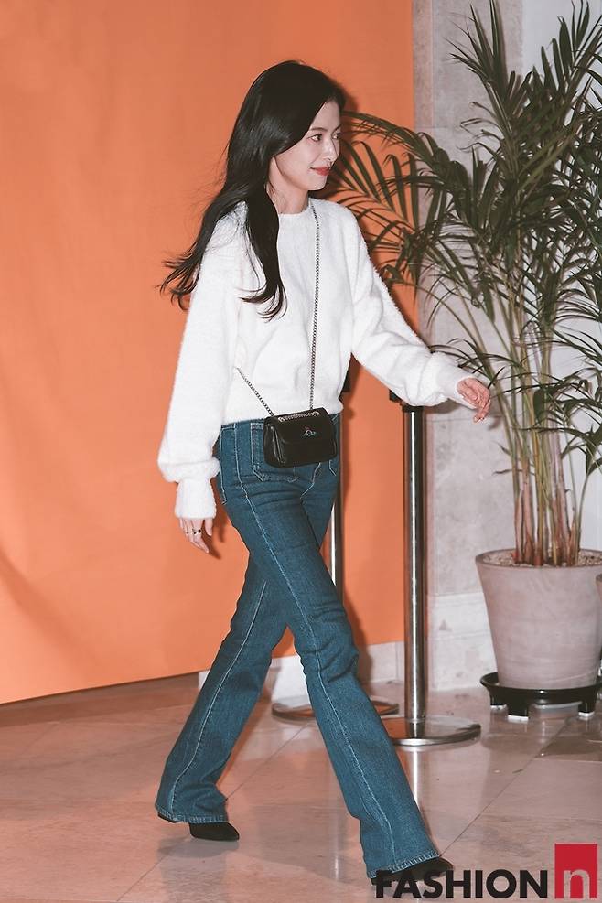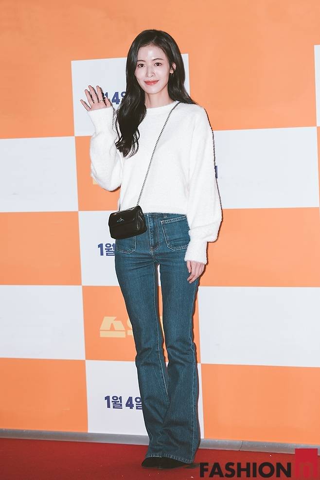 이날 지우는 가냘픈 몸매와 샤프한 얼굴에 데님 팬츠와 화이트 니트웨어의 꾸안꾸 시사회룩으로 눈길을 사로잡았다.