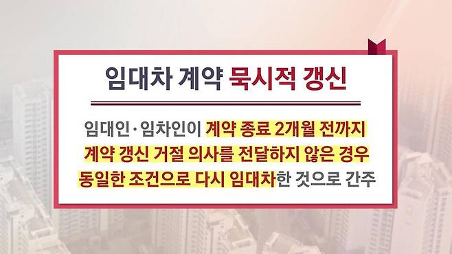 전세 세입자가 임대차 계약 종료 2개월 전까지 집주인과 계약 갱신 거절 의사를 주고받지 않은 경우 같은 조건으로 전세계약이 자동 연장됩니다. 이를 '묵시적 갱신'이라고 하는데요. 이 경우 기존에 가입한 전세보증보험은 전세금을 보장해주는 효력을 잃게 돼 세입자들의 주의가 필요합니다.