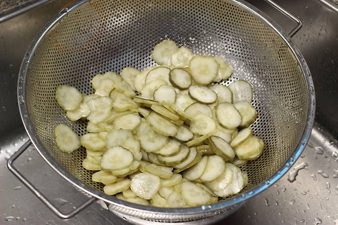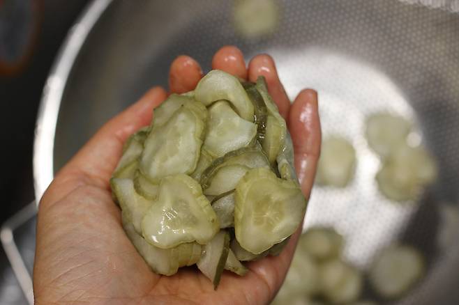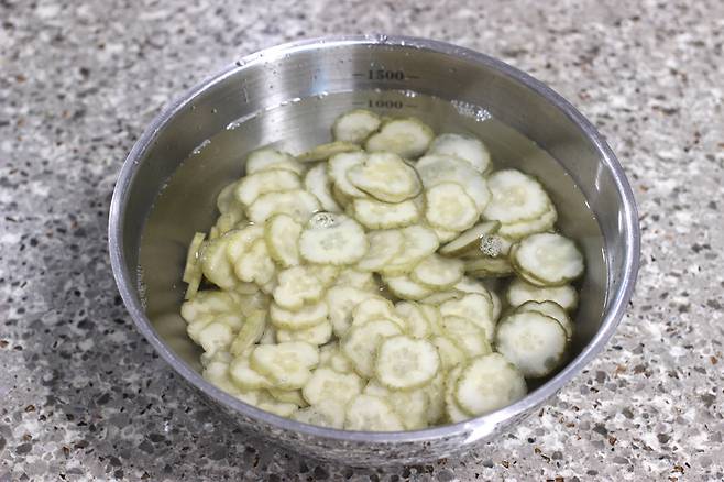 찬물에 풍덩 담가요. 이대로 20분 정도 담가 짠맛을 뺍니다. 보통 오이나물은 생오이를 소금에 절여서 수분을 빼서 만드는데 오이지는 이미 소금에 절여져 있기 때문에 오히려 소금의 짠맛을 좀 빼야 해요.