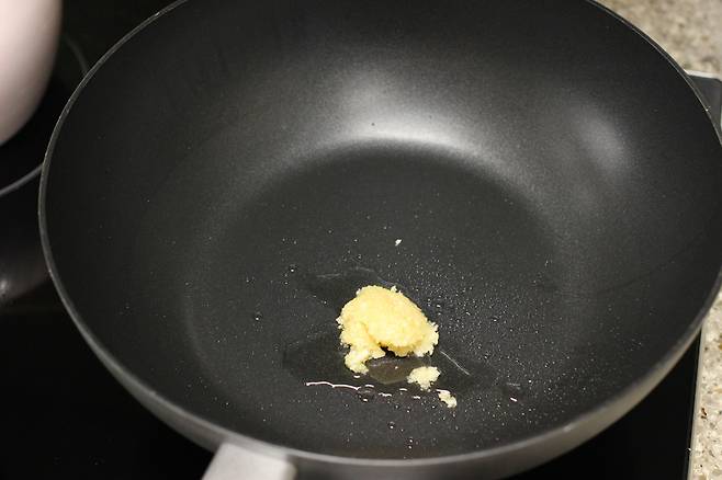 팬에 기름을 1~2큰술 두르고 다진마늘 1/2큰술 넣어 중불에서 30초 정도 볶아요.