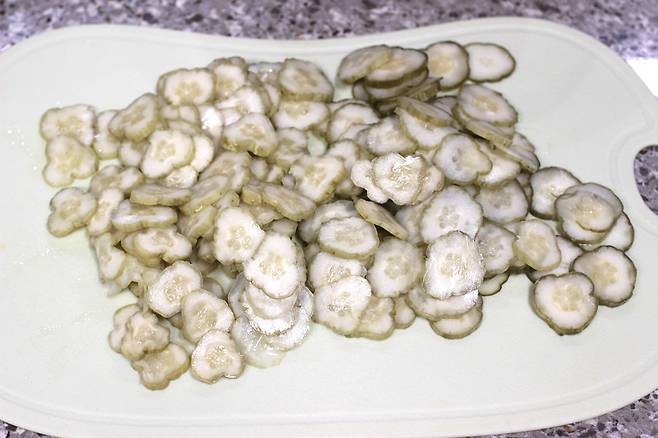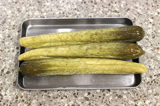 오이지 3개 꺼냈어요. 전통 방식 소금으로 만든 것 말고 소금, 식초, 설탕에 한번에 절인 걸 사용하는 것이 좋아요. 그래야 새콤, 짭쪼롬한 맛을 모두 가지고 있기 때문이에요.
