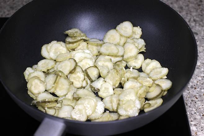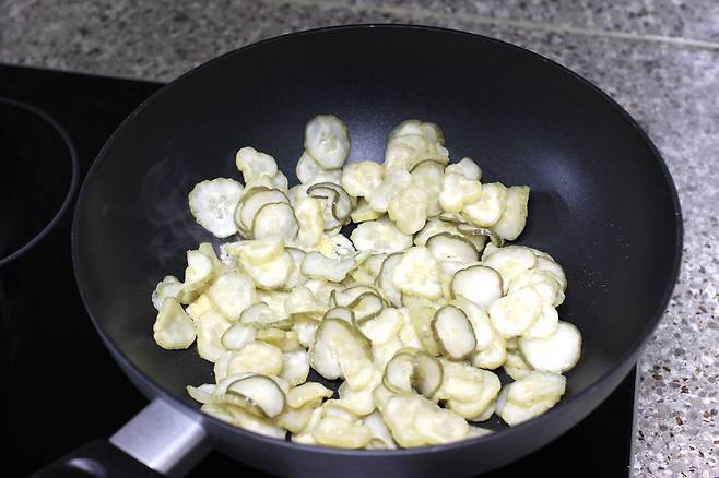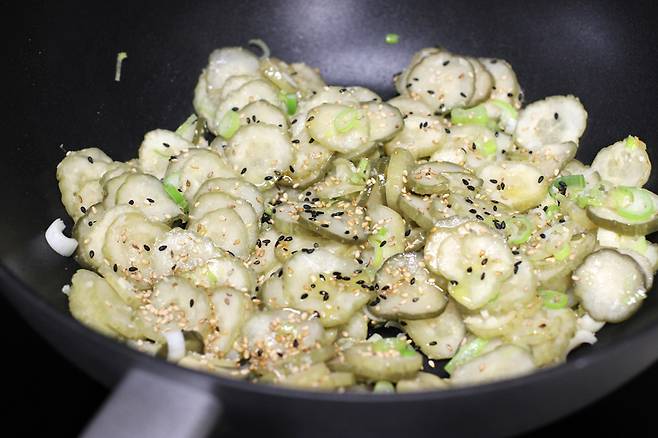 썰어둔 대파도 넣어요. 오이는 완벽히 익힐 필요가 없기 때문에 3~4분 정도 볶아 기름으로 코팅하고 불을 끄면 돼요. 하나 먹어보고 짠맛이 너무 빠져서 싱겁다면 소금을 조금 넣어 간을 추가하면 됩니다.