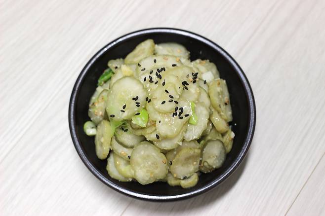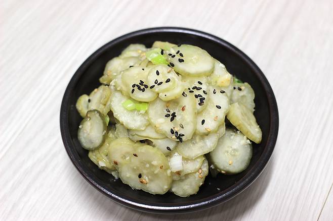 참기름 조금 뿌리고 통깨 솔솔 올리면 아작아작 오이나물 완성이에요. 뜨거울 때 먹는 것 보다는 이대로 식혀서 차가울 때 먹으면 더욱 맛있어요.