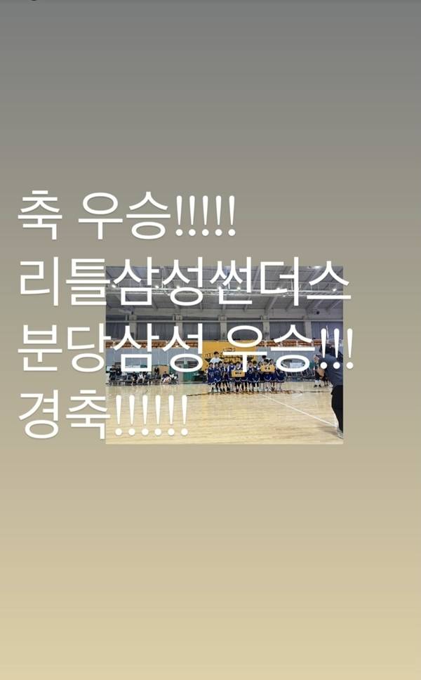 이민정은 5월 31일 자신의 SNS 스토리를 통해 “축 우승!!!!! 리틀삼성썬더스 분당삼성 우승!! 경축!!!!!”이라는 메시지와 함께 농구 경기장에서 촬영한 단체 사진을 공개했다.