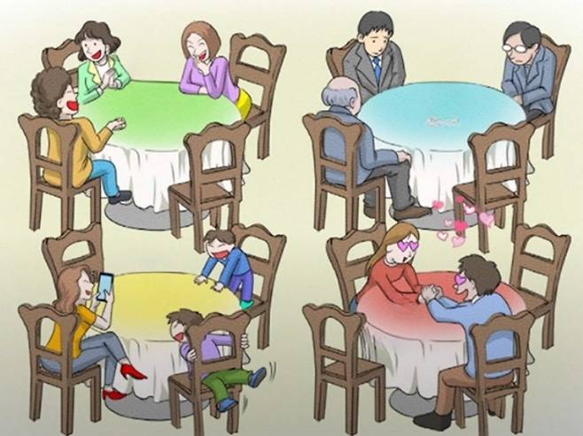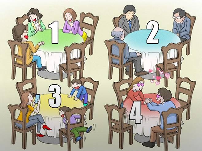 이 테스트는 사람들이 테이블에 각기 다른 형태로 앉아있는 그림 4개로 구성됐다. 그림을 보고 가장 앉기 싫은 자리를 고르면 된다.