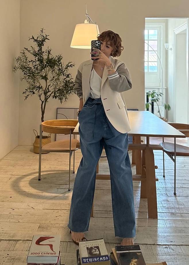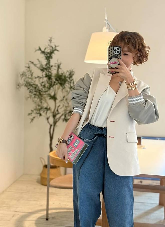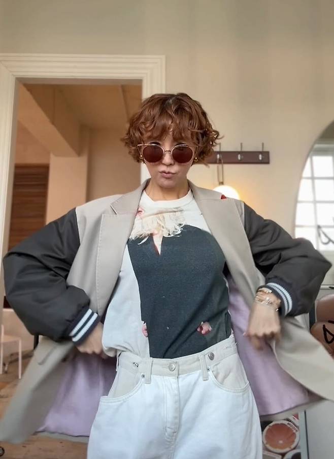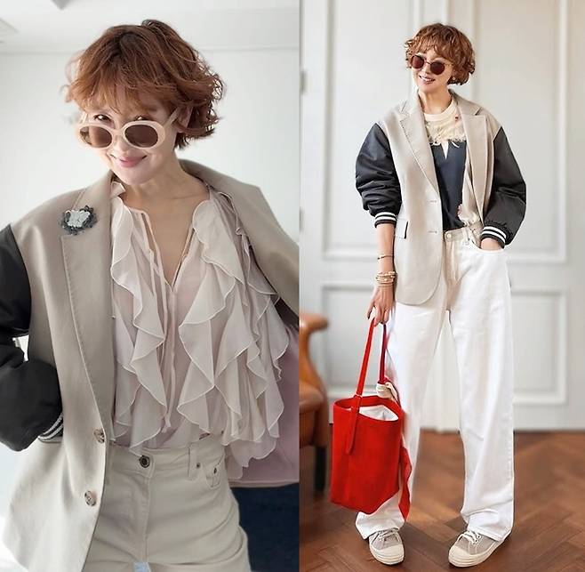 공개한 사진에서 최은경은 짧은 헤어 스타일에 화이트 진과 데님 팬츠를 입고 오버사이즈 봄머 재킷을 매치한 스타일로 감각적인 봄 데일리룩을 완성했다.