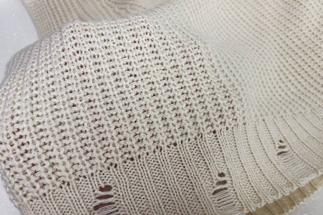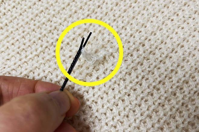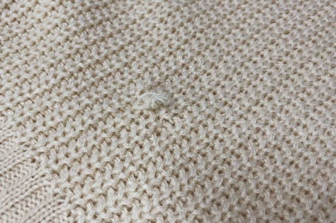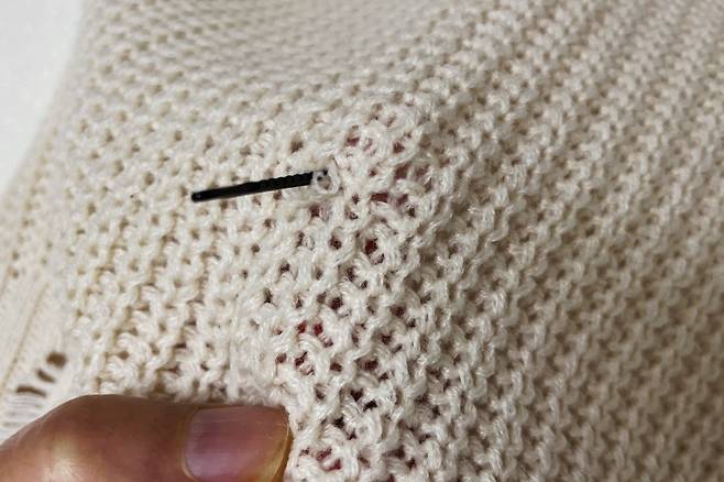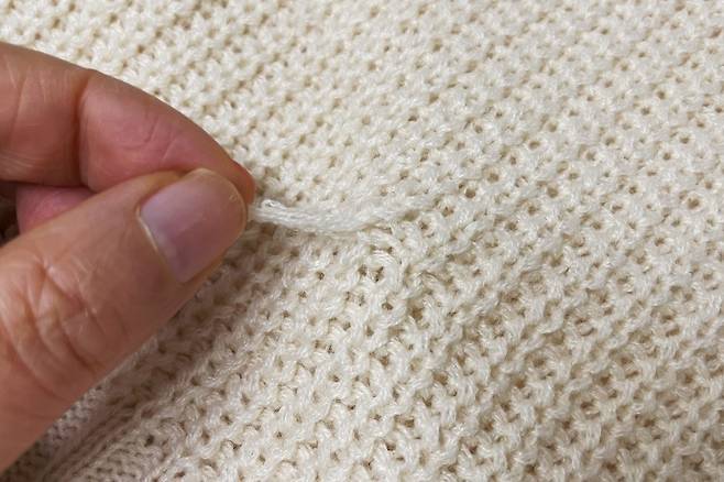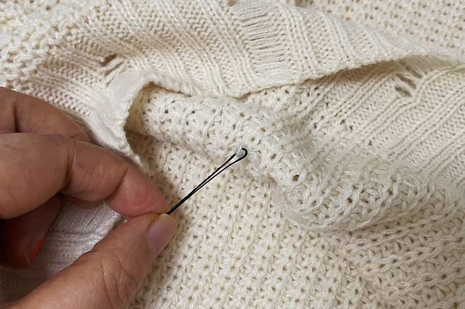 미세한 올 풀림은 니트를 대각선으로 잡고 살살 잡아당겨도 해결되기도 하는데요. 눈에 띄어 올 풀림이 생기면 잘못 잡아당겨서 오히려 복구가 어려울 수 있어요. 그렇다고 튀어나온 실을 가위로 잘라내면 니트에 구멍이 생기니 절대 자르시면 안 됩니다.