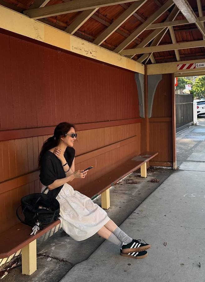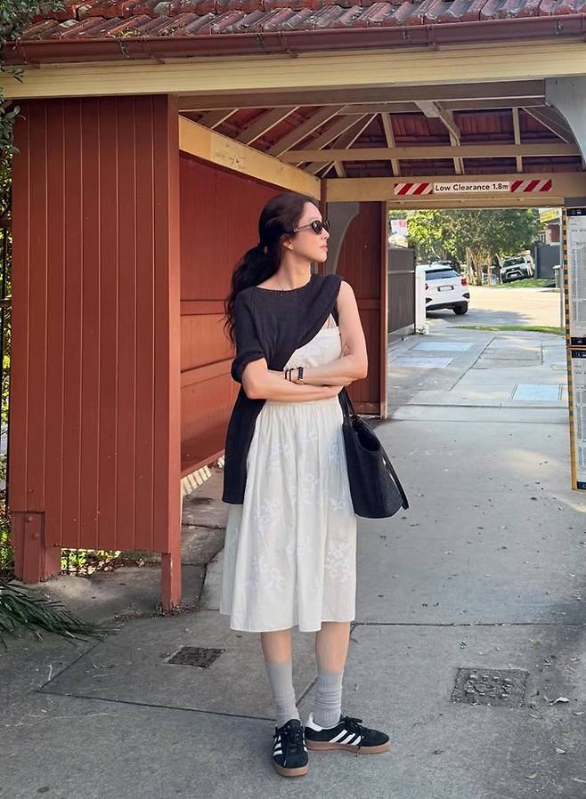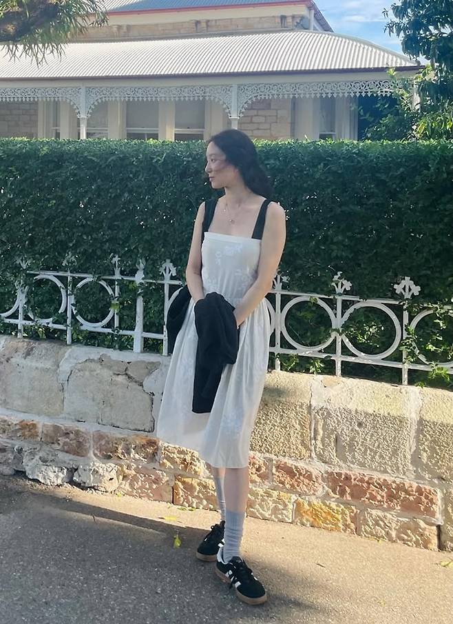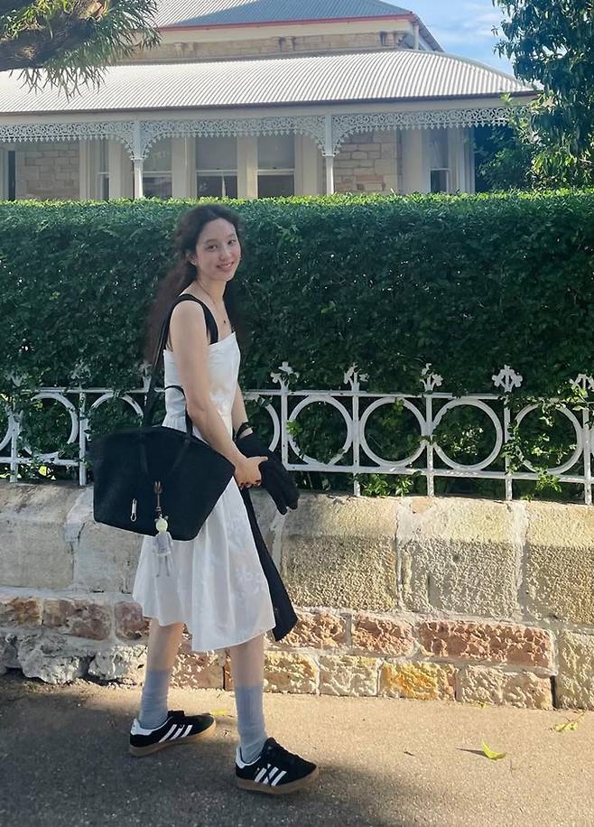 또 자연스럽게 늘어뜨린 헤어 스타일과 민낯에 캐주얼한 블랙 스니커즈와 발목까지 올라오는 화이트 양말, 팔에 걸친 커다란 블랙백을 매치해 소녀 같은 감성을 드러냈다.