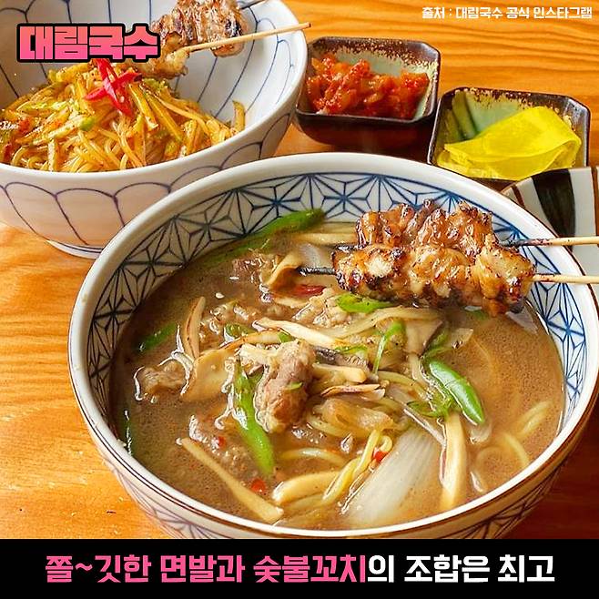 고소하고 한 번 먹으면 불향이 입안에서 확 나는 숯불꼬치와 잘 어우러지는 온면, 비빔면, 냉면으로 나누어지는데 대림국수의 국수를 먹으면 일반면과는 다른 쫄깃함을 느낄 수 있다고 합니다.