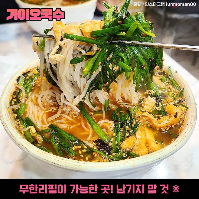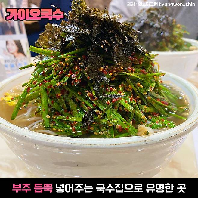 가이오국수는 부추를 듬뿍 넣어주는 국수집으로 유명한 곳이에요. 이곳도 양이 많아서 유명한 곳인데 심지어 무한리필이라는 점! 그리고 이곳은 국수를 제외한 타 음식물이 반입되는 국수가게입니다.