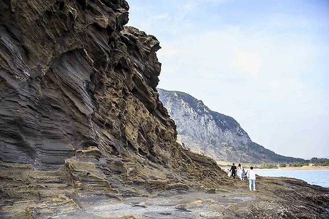 ‘용머리해안’이라는 이름은 우연히 붙은 것이 아닙니다. 거대한 산방산 자락에서 길게 바다로 뻗은 해안 지형이 마치 용이 머리를 바다로 들이미는 형상을 하고 있기 때문이죠.
