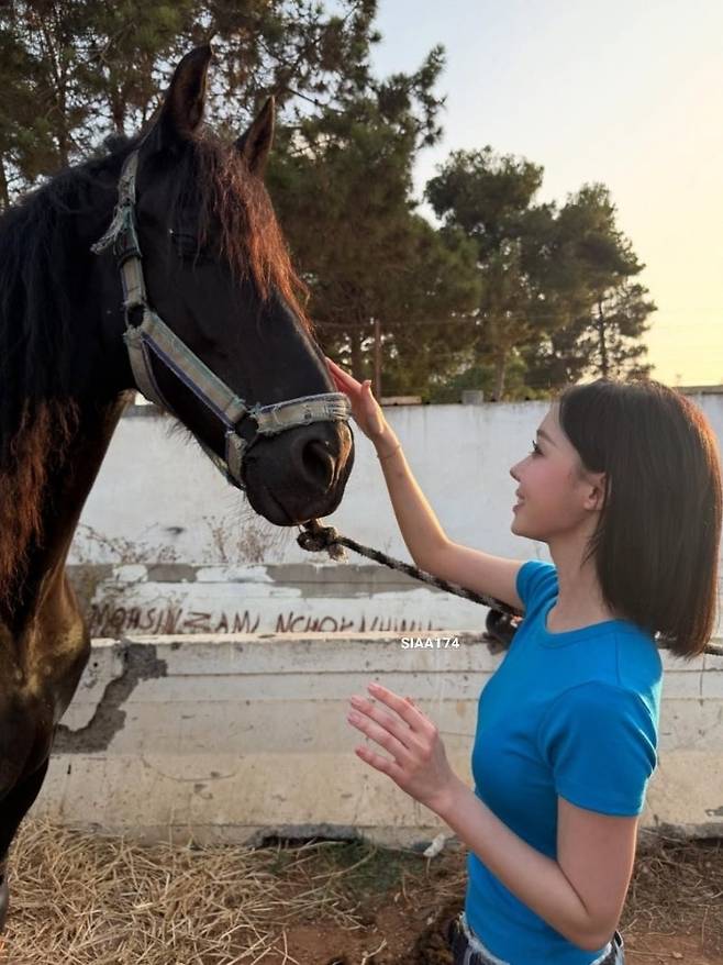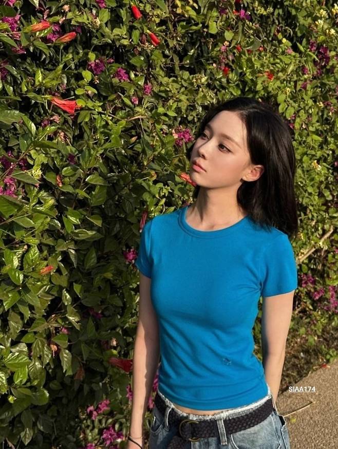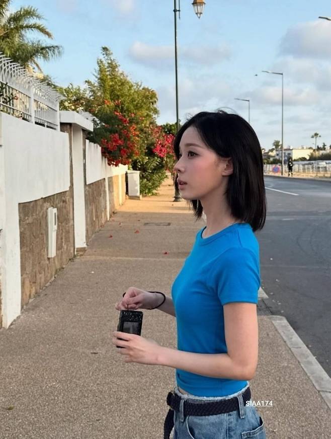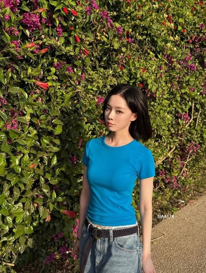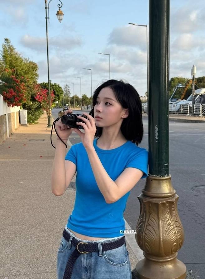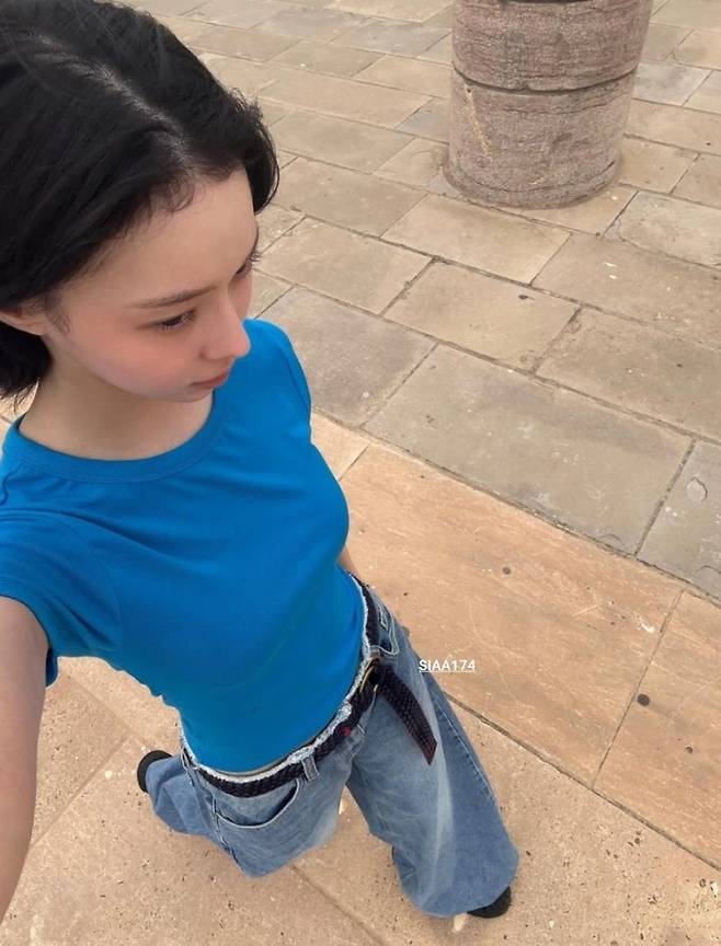 최근 에스파 윈터님의 여름 사복 패션으로 공개된 데님 팬츠 + 블루 반팔티 코디! 선명하고 청량한 색감이 시선을 사로잡았는데요. 공개 후 예쁘다는 반응이 쏟아진 룩이죠. 특히 단발머리가 너무나 깜찍하고 사랑스럽습니다.