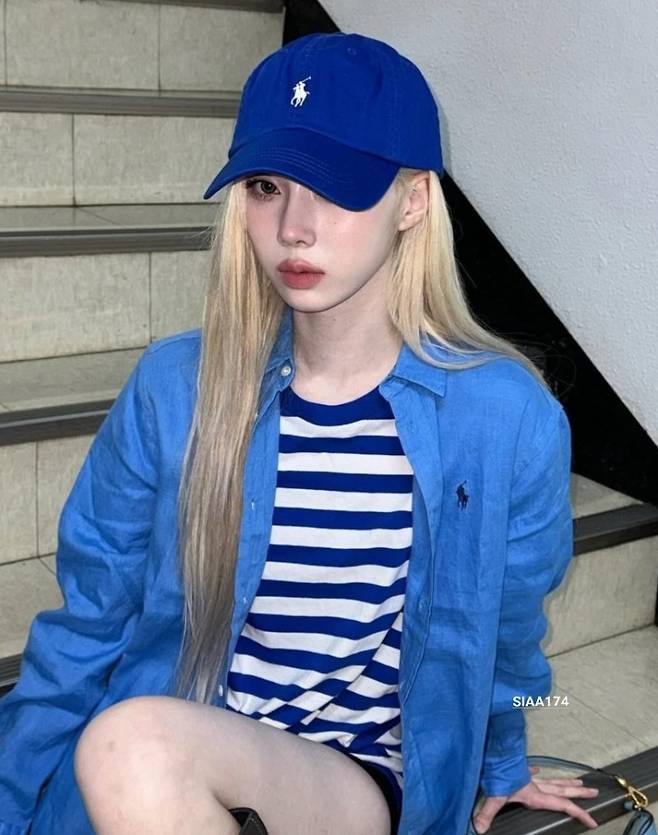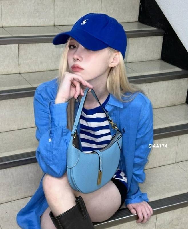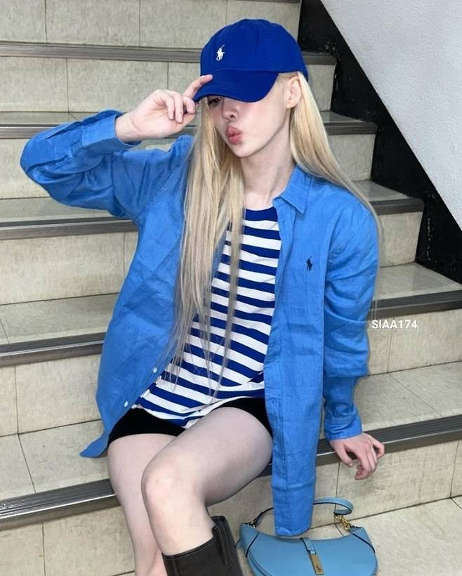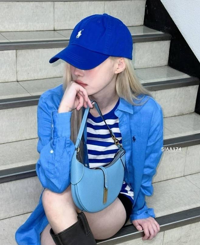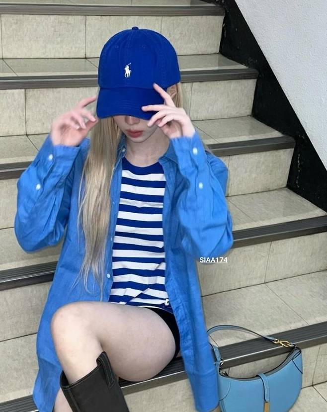 워낙 레전드 코디라 현재까지도 여름 시즌에 회자되고 있는 윈터님의 폴로 랄프로렌 블루 셔츠 + 스트라이프 반팔티 + 볼캡 코디에요. 이렇게 가방까지 블루 아이템을 활용하면 과해 보일 수 있지만, 톤온톤으로 매치해 감각적이고 트렌디한 룩을 연출한 점이 돋보이는데요. 블랙 쇼츠와 롱부츠로 톡톡 튀는 파란색감을 중화시켜주며 멋스럽게 착용했습니다.