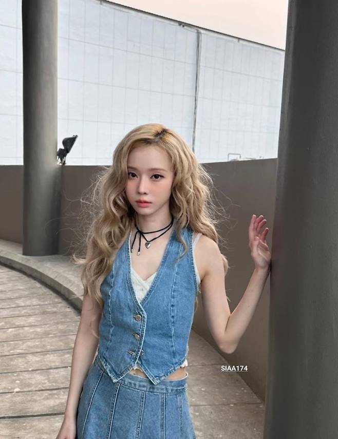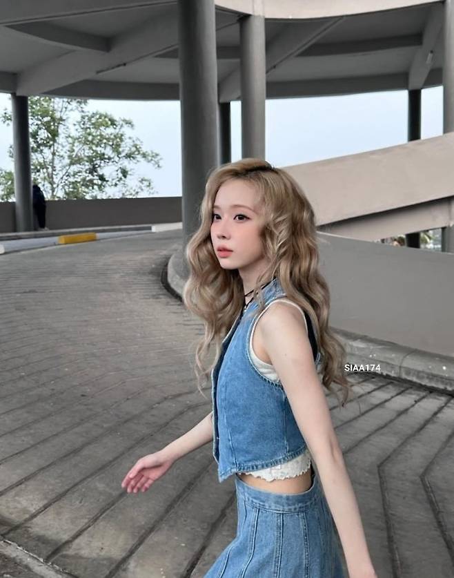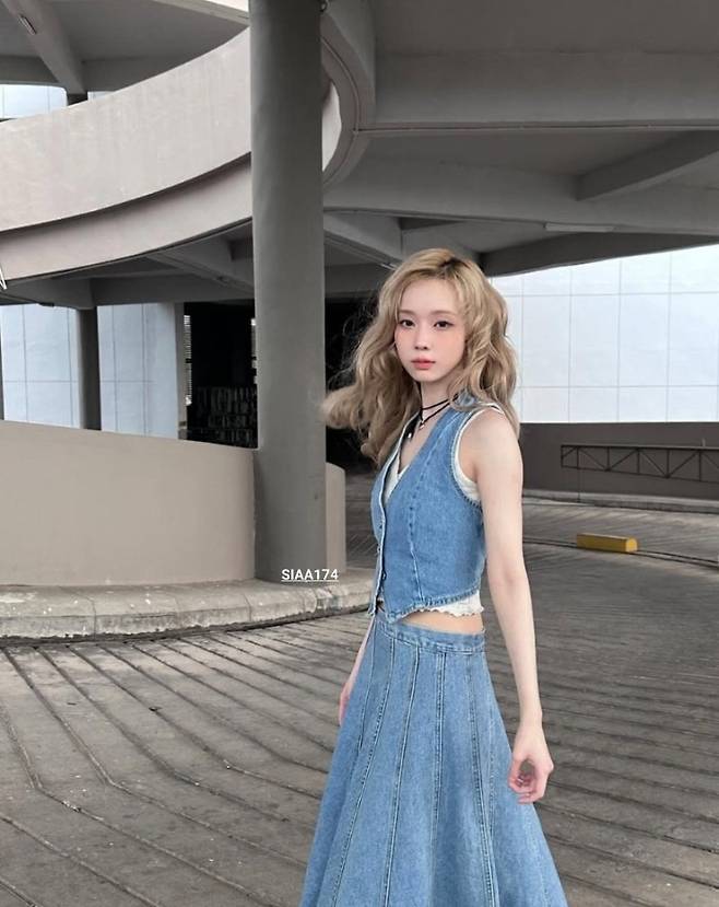 금발 머리 시절에 연출한 데님 베스트 + 롱스커트 셋업룩 또한 페미닌하면서도 청량한 무드가 돋보이는 코디였죠. 크롭한 레이스 이너에 레이어드해 조화로운 느낌을 더했네요. 캐주얼하면서도 여성스러운 분위기를 동시에 연출할 수 있는 투피스라 여름 나들이룩, 데이트룩으로 참고해 보셔도 좋을 것 같아요.