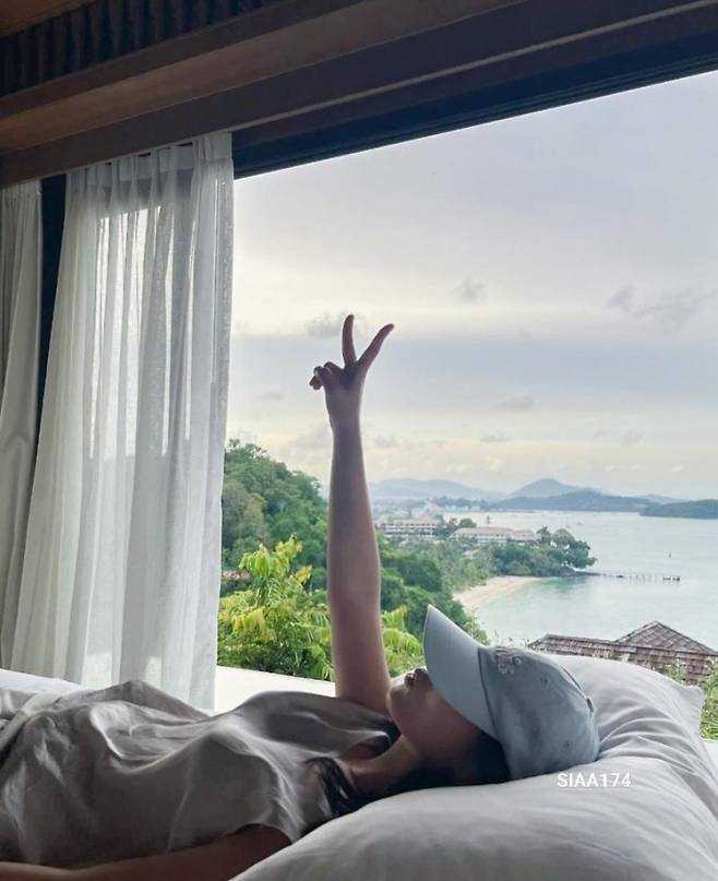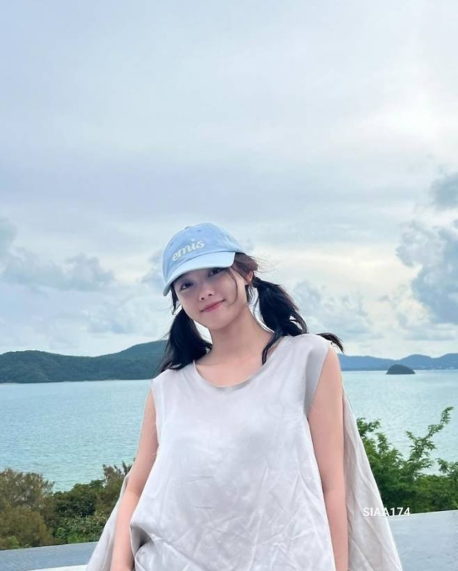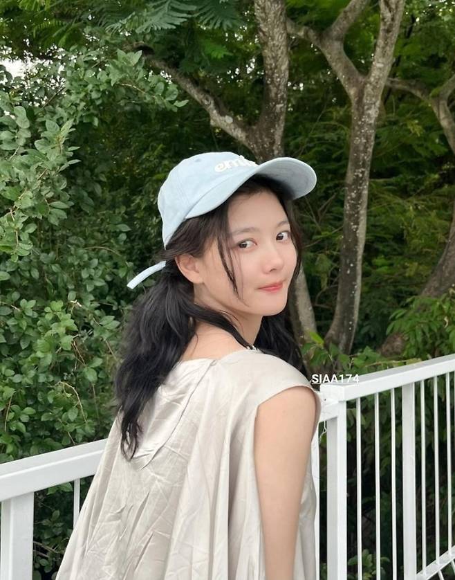 김유정님의 바캉스룩 속 나시 블라우스 코디에 화사함을 더해준 파스텔톤 라이트 블루 컬러의 볼캡은 이미스 아플리케 볼캡이에요. 컬러풀한 색감은 아니면서도 청량해 보이는 컬러감으로 여름 코디에 부담 없이 착용하기 딱이죠.