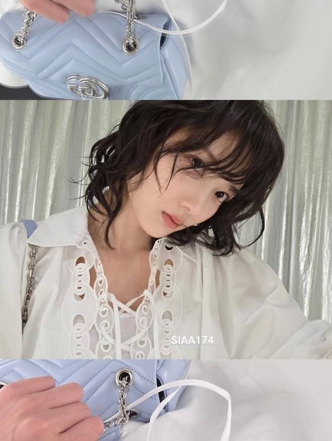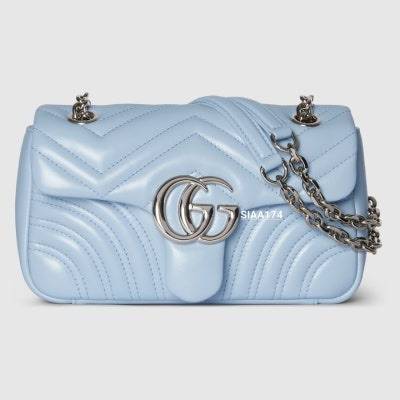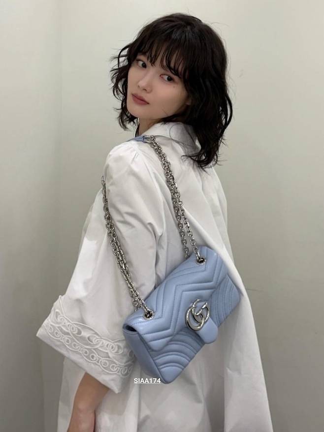 김유정님의 최근 바캉스룩 속 블루 코디도 화제인데요. 홀터넥 비키니를 매치해 청량하면서도 고혹적인 분위기를 연출했습니다. 화이트 오버핏 셔츠 원피스 코디에 매치한 하늘색 컬러의 구찌 가방은 요즘 핫한 구찌 마몽 숄더백이에요. 클래식하고 세련된 디자인에 시원해 보이는 컬러로 여름 코디에 특히 제격인데요. 스몰 사이즈라 데일리로 가볍게 들기 좋은 제품입니다.