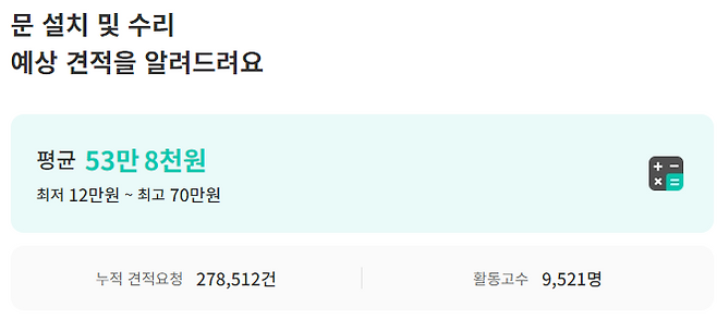 숨고 내에서 거래되는 문 설치 및 수리 평균 비용은 건당 53만 8천 원입니다. 최저 비용은 12만 원, 최고 비용은 70만 원으로 책정되어 있어요.