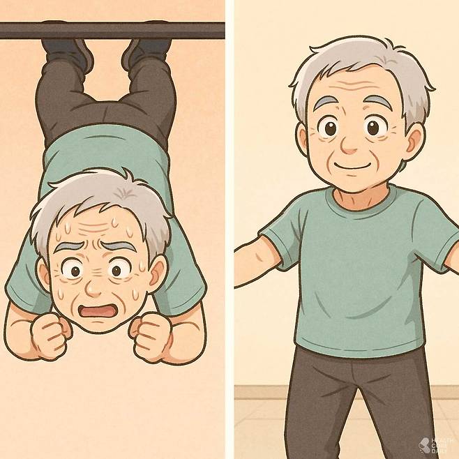거꾸로 매달리는 운동 역시 60대 이후에는 피해야 한다. 뇌압과 안압이 급격히 올라가 뇌출혈이나 눈 질환 위험이 커진다. 이 대신 팔 벌려 돌리기 같은 간단한 어깨 운동을 20회씩 하면 상체 혈류 개선에 도움이 된다.