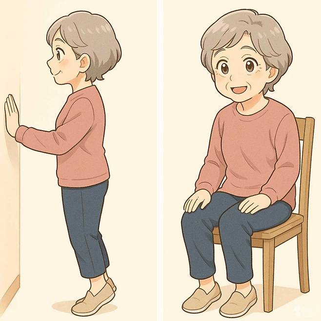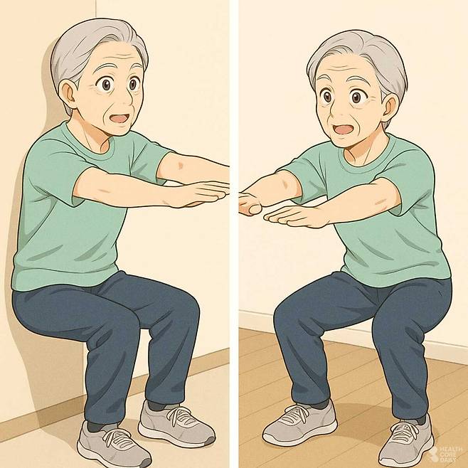 스쿼트는 하체 근육 강화에 탁월하지만 자세가 흔들리면 무릎에 무리가 간다. 벽에 등을 대고 하는 월 스쿼트부터 시작해 10회씩 2세트로 연습하면 안전하다. 익숙해지면 일반 스쿼트로 바꾸되, 무릎이 발끝 앞으로 나오지 않도록 주의해야 한다.