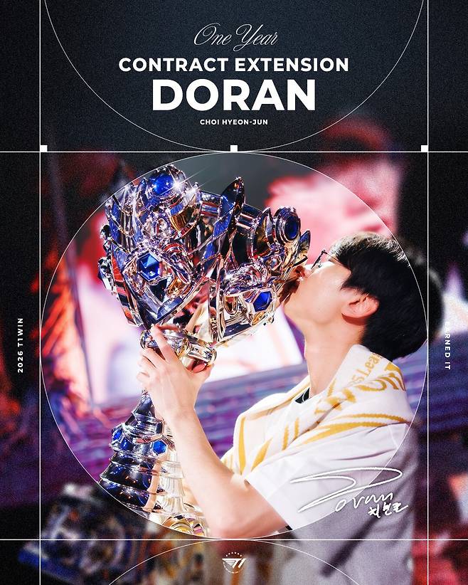 2025년 T1에 합류한 '도란'은 1+1 옵션 형태의 계약이었는데, 2026 시즌을 앞두고 1년 더 T1과 함께하게 됐다. '도란'은 올해 T1에 합류한 뒤 최고의 해를 보냈다. 그동안 국제전에서 만족스럽지 못한 성적을 거뒀던 '도란'이지만 올해 월즈에서 만개하며 팀과 함께 우승을 차지했다.