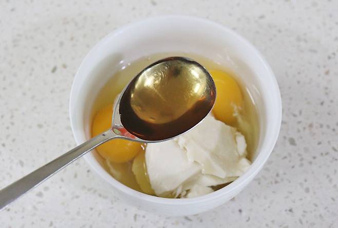 2. 볼에 계란을 풀고 연두부를 넣습니다. 이때 연두부를 완전히 으깨지 말고 덩어리가 살짝 씹히게 섞는 것이 식감의 비결입니다.