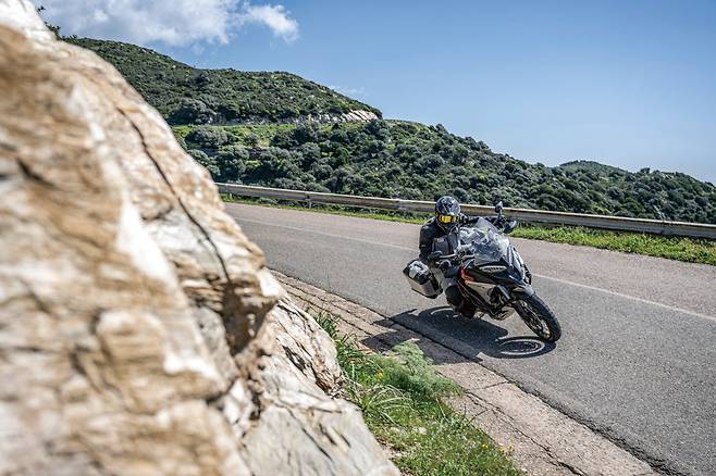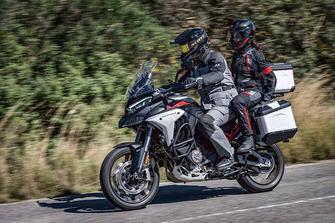 새로운 패니어 시스템과 톱케이스를 장착해 패니어를 후방으로 30mm, 탑케이스를 6mm 뒤로 옮겼다. 덕분에 탠덤 라이딩 시 승객을 더욱 편하게 모실(?) 수 있게 되었다. 그런데 혼자 간 미디어 테스트에서는 그걸 확인해볼 수 없는 노릇이다. 하지만 두카티는 다 계획이 있었다. 테스트 중간에 풀세트의 라이딩 기어를 갖춘 탠덤 라이더를 준비해 코스 중 일부구간에서 직접 탠덤 라이딩을 경험해볼 수 있었다. 앞서 말한 우아한 주행성능과 스카이훅 서스펜션, 그리고 조절된 패니어 위치가 조합되어 탠덤 라이딩 시에도 쾌적하게 주행할 수 있다. 심지어 달리는 동안에는 뒷사람의 존재가 거의 느껴지지 않았다. 잠깐, 이거 좋은 게 맞는 건가?