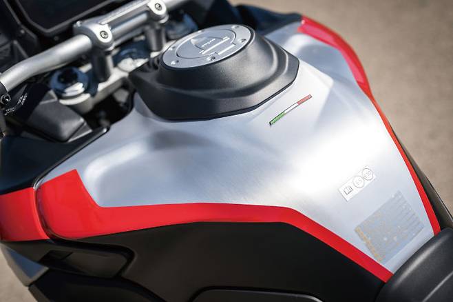 멀티스트라다 V4 랠리의 가장 큰 특징은 30리터 연료탱크다. 이것 자체는 그리 놀랍지 않다. 30리터 탱크를 달고 있는 경쟁자들도 많고 두카티에도 멀티스트라다 1200 시절부터 30리터로 연료탱크를 확장한 멀티스트라다 엔듀로가 존재했기 때문이다. 하지만 이번에는 22리터에서 30리터로 8리터, 그것도 35%가 늘었는데 외형은 거의 커지지 않았다. 어떻게 이게 가능했던 것일까? 답은 의외로 간단했다. 기존의 연료탱크는 플라스틱으로 제작된 내부 탱크를 외부 커버로 덮는 2중 구조였는데 이걸 통짜 알루미늄 탱크로 교체한 것이다. 지금까지 선보인 모든 30리터 어드벤처, 그러니까 월드 투어러의 조건을 갖춘 바이크 중 가장 콤팩트한 사이즈다. 연료 제외 차량 중량은 240kg으로 V4 S 대비 11kg이 무거워졌지만 기본 사양으로 메인스탠드가 추가된 것을 고려하면 실제 증량은 크지 않다.