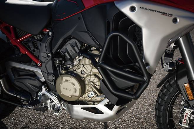앞서 V4 랠리가 오프로드 성능을 강화한 모델이라고 설명했지만 온로드 성능을 희생한 모델은 아니다. 원래 가지고 있던 온로드 성능은 그대로 갖추고 있다. 특히 핸들링은 탁월하다. 가볍게 기울어지고 라인을 그리는 능력은 두카티 스포츠 바이크 유전자를 그대로 담고 있다. 특히 서스펜션이 노면을 충실히 눌러주는 느낌이 좋았다. 피렐리 스콜피온 랠리 STR타이어가 그립이 이렇게 좋았던가 싶을 정도다. 이런 가벼운 핸들링은 역회전 크랭크샤프트에서 오는 것이다. 엔진의 회전방향을 반대로 돌려서 휠을 비롯해 차체 전반에서 발생하는 자이로효과를 상쇄시키는 방식이다. 파니갈레 V4에 처음 적용해 좋은 반응을 얻었고 이제 스트리트파이터, 멀티스트라다, 디아벨 등 새로운 V4패밀리의 특징이 되었다. 이 거대한 차체가 얼마나 코너에서 가볍게 움직이는지 느껴본다면 이 기술을 강조하는 이유를 알게 될 것이다. 그야말로 흠잡을 데 없는 주행성능이다.
