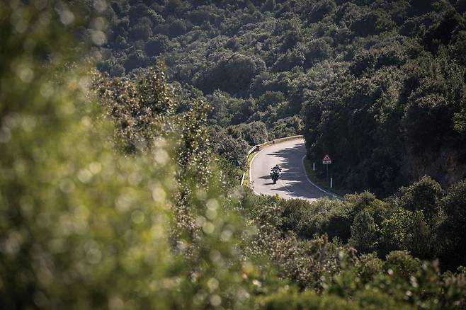 멀티스트라다 V4 랠리의 움직임을 한 단어로 정의하자면 우아함이다. 170마력이란 어드벤처 바이크 장르에서는 전에 없던 강력한 파워를 가지고 있지만 숫자보다 와 닿는 것은 이 우아함이었다. 일반적으로 엔진이 강력해질수록 차체가 라이더보다 앞서서 튀어나가려는 움직임을 보여주고 라이더의 신경은 곤두설 수밖에 없다. 하지만 멀티스트라다 V4 랠리는 시종일관 여유롭고 우아하게 움직인다. 170마력이 맞나 싶을 정도로 부드럽다. 100마력 남짓의 어드벤처와 비교해도 다루기가 더 쉬운 느낌이다. 달리는 동안 주행모드를 몇 차례 확인했을 정도다. 풀파워의 출력에 스로틀 반응이 민첩한 스포츠 모드에서조차 라이딩의 스트레스가 적다. 주행 내내 결코 라이더를 앞서지 않는 느낌이랄까? 다루기 쉽고 부드럽다 해서 170마력이 의미가 없는 것은 아니다. 내가 진짜로 달리고자 할 때는 이야기가 완전히 달라진다. 스로틀을 거칠게 감아쥐는 순간 펑 터지듯 엔진에서 폭발적인 토크를 쏟아내고 속도는 순식간에 붙는다. 머릿속과 손, 엔진, 그리고 뒷바퀴가 하나의 선으로 직결된 느낌, 생각이 그대로 출력으로 바뀌는 느낌이다. 그리고 이렇게 강력한 출력에도 끌려가는 느낌이 아닌 내가 리드하고 있다는 느낌이 들 수 있는 것은 실제 속도의 절반 정도로 느껴지는 속도감 덕분이다.