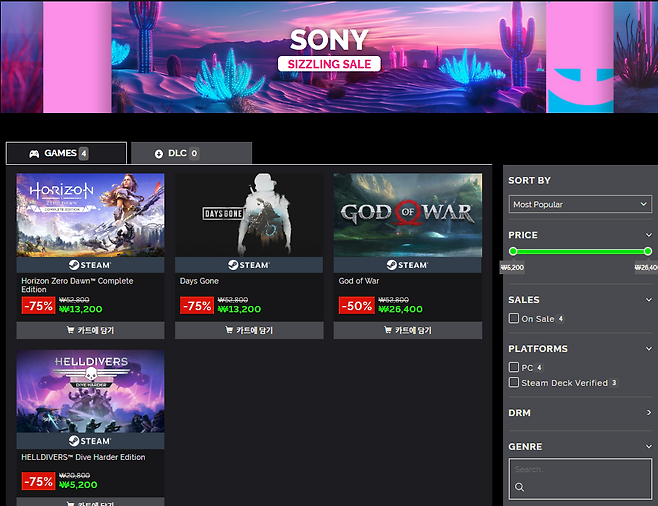 전작에 비해 더욱 강력해진 기계생명체와 방대한 오픈월드 그리고 짜임새 있는 스토리는 이번 시즐링 세일 타이틀 중 최고의 작품으로 꼽아도 손색이 없을 정도죠.특히 PC 버전 호라이즌 포비든 웨스트는 프레임 속도 제한 해제, 4K지원, 엔비디아 리플렉스 지연 감소, 32DLSS 3 업스케일링 등 기존의 콘솔버전과는 비교도 할 수 없을 정도로 업그레이드된 그래픽 퀄리티로 재미를 더하고 있습니다.호라이즌 포비든 웨스트 컴플리트 에디션이 이번 시즐링 세일 동안 20% 할인된 가격에 판매됩니다.