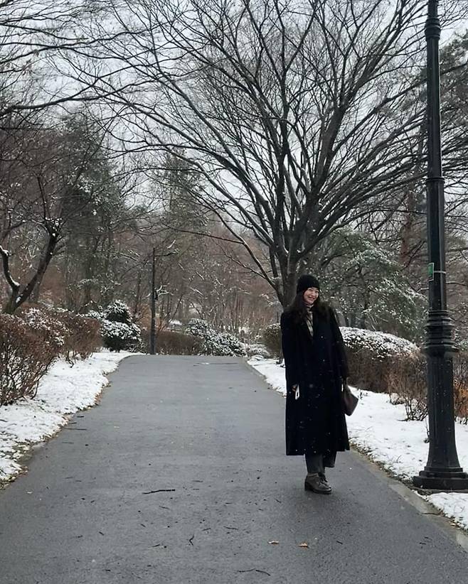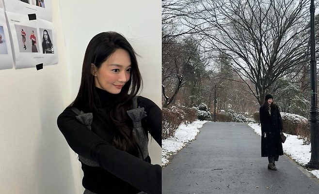 신민아는 긴 블랙 코트와 부츠를 착용하며 겨울 산책룩을 완성했다. 코트는 보온성과 스타일을 동시에 잡았으며, 눈 덮인 공원의 풍경과 어우러져 차분하면서도 고요한 분위기를 연출한다. 손에 든 작은 가방은 실용성과 패션을 겸비한 아이템으로 보인다.