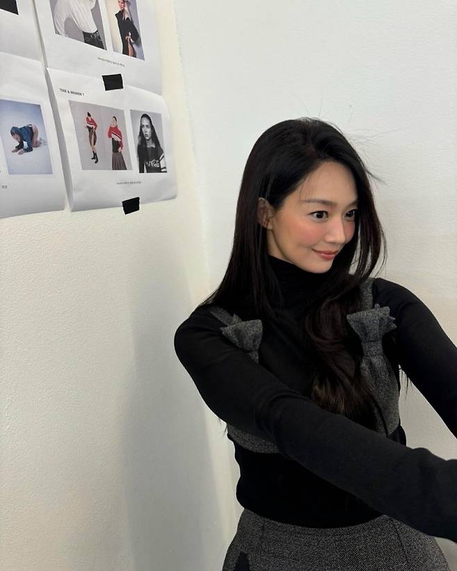두 번째 사진에서 신민아는 블랙 터틀넥과 그레이 톤의 스커트를 매치해 모던하면서도 차분한 스타일을 선보였다. 터틀넥 상의에 부착된 독특한 디테일은 심플한 룩에 개성을 더하며, 긴 생머리는 자연스러운 아름다움을 강조한다. 배경에 붙여진 촬영 콘셉트 이미지들과 어우러져 화보 현장의 느낌을 전달한다.