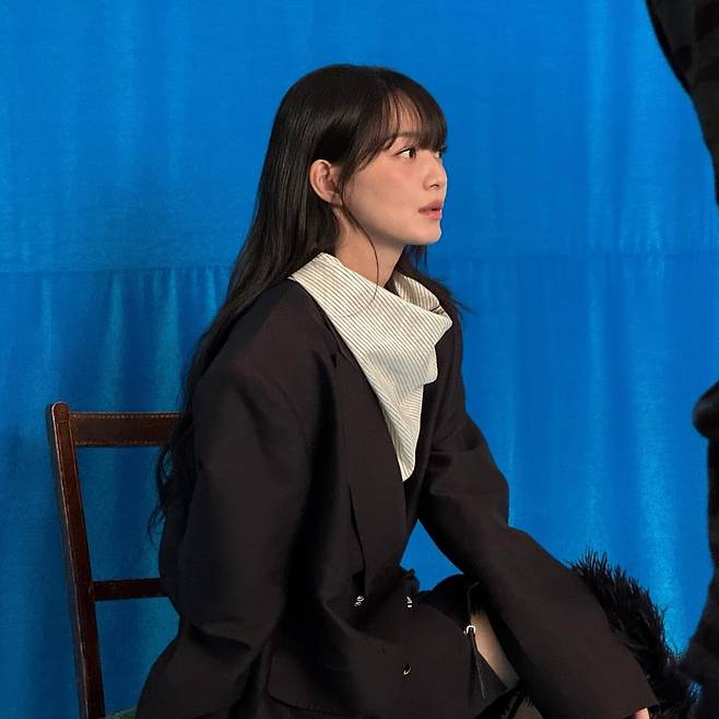 첫 번째 사진에서 신민아는 블랙 더블 브레스트 수트를 착용하며 클래식한 매력을 연출하고 있다. 흰색 스카프를 활용해 단조로운 블랙 룩에 포인트를 더했고, 긴 웨이브 헤어스타일은 전체적으로 우아한 분위기를 강조한다. 배경의 푸른색과 대비되어 더욱 세련된 느낌을 준다.