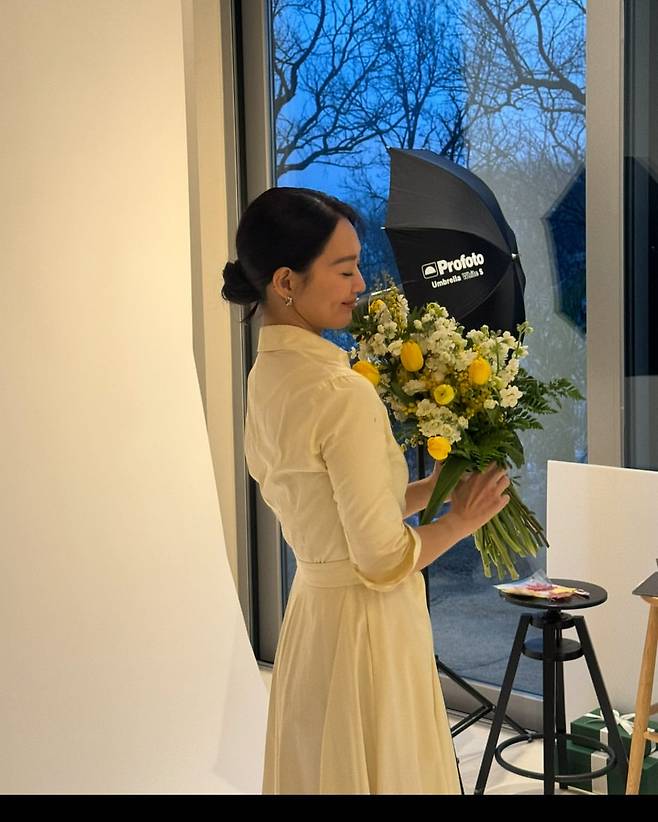 네 번째 사진에서는 신민아가 크림색 롱 드레스를 입고 꽃다발을 들고 있는 모습이 돋보인다. 드레스는 허리 라인을 강조하며 여성스러운 실루엣을 완성했다. 머리를 깔끔하게 올린 헤어스타일은 드레스와 조화를 이루며 단아함을 더한다. 창밖의 풍경과 스튜디오 조명은 따뜻한 봄날의 분위기를 연출한다.