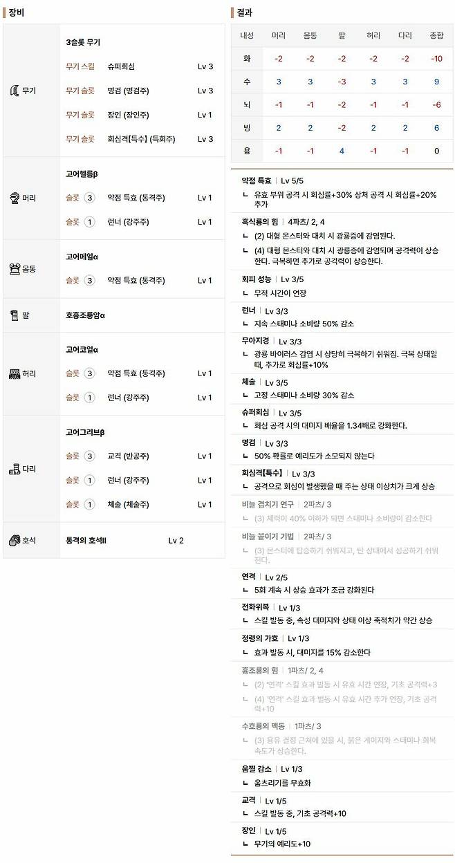 방어 스킬에서는 주요 자원인 스태미나 관리에 유용한 런너, 체술을 가져가는 이들이 많다. 스태미나 체감률에 큰 영향을 주기에 대부분이 채용하는 스킬들이다. 만약, 저스트 회피 연습 단계라면 회피 성능을 활용하는 것도 괜찮다. 저스트 회피 자체에 영향을 주진 않지만, 기본 회피의 무적 시간을 늘려 안정성을 가져갈 수 있다.