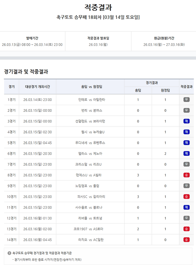축구토토 승무패 18회차 14경기 가운데 승(홈팀 승) 4경기, 무(무승부) 5경기, 패(원정팀 승) 5경기로 집계됐다.