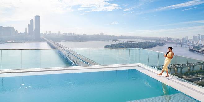 한강뷰로 유명한 호텔 나루 엠갤러리는 서울세계불꽃축제 명당으로 가장 먼저 꼽히는 호텔 중 하나인데요. 루프탑 수영장에서 보는 불꽃놀이가 아름다워서 주목받는 장소예요. 일부 객실에서는 불꽃놀이를 직접 관람할 수 있고, 이외에는 풀파티를 즐기면서 인피니티풀에서 관람할 수 있죠.