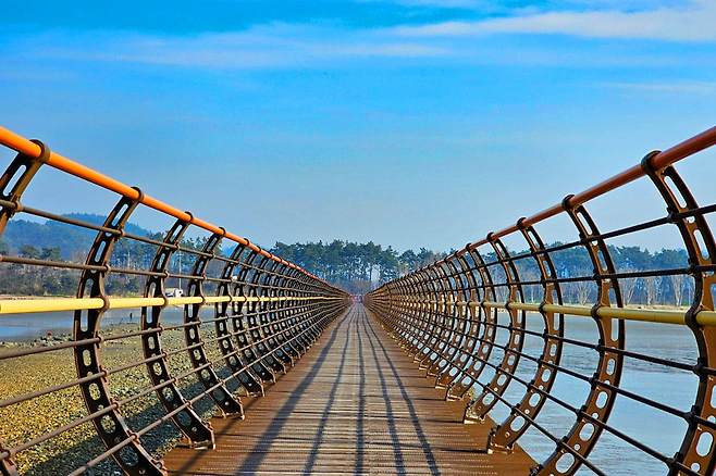 다리의 난간은 독특하게도 곡선으로 디자인되어 마치 터널 속으로 빨려 들어가는 듯한 느낌을 받을 수 있으며 선 사이사이로 보이는 푸른 배경은 시원함을 선사합니다.